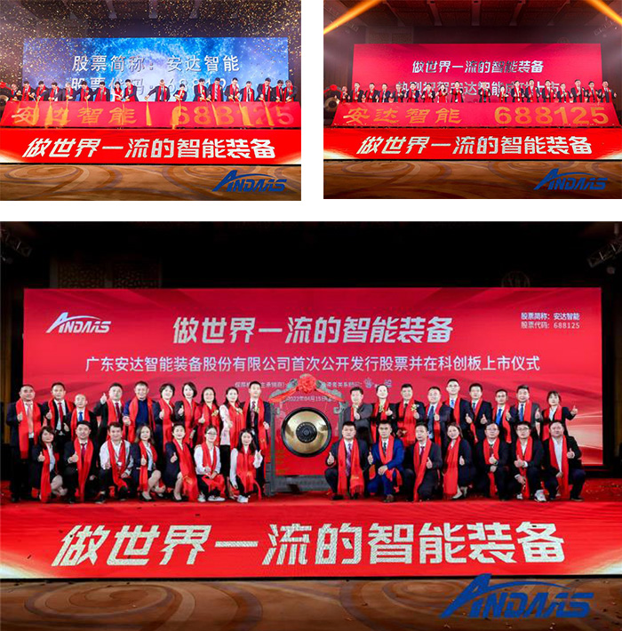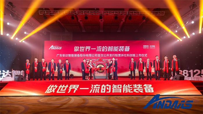 4月15日,廣東安達智能裝備股份有限公司(簡稱:安達智能,股票代碼:688125)上市儀式在東莞市松山湖凱悅酒店順利舉行。東莞市各級政府代表、公司實控人及股東代表、中介機構、上市協會、合作伙伴、公司管理團隊及特邀嘉賓等參加了此次上市儀式。
