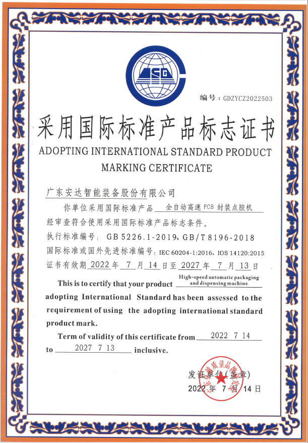 采用國際標準產品標志證書